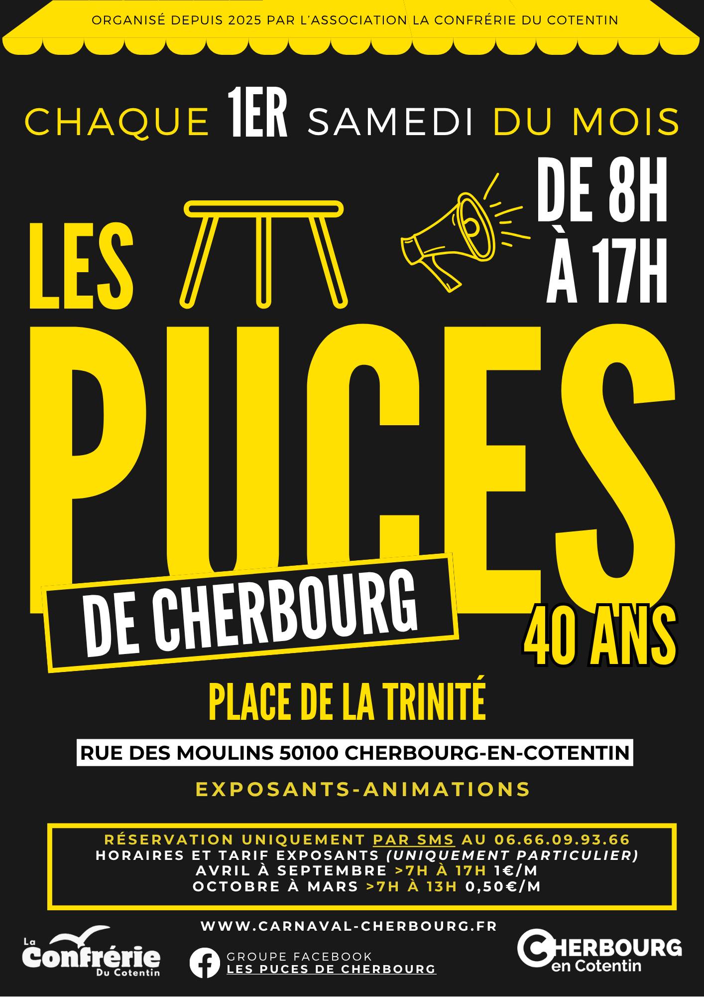 L’association du Carnaval de Cherbourg-en-Cotentin est heureuse de vous annoncer qu’elle reprend l’organisation du Marché aux Puces de Cherbourg ! À partir du samedi 3 mai, rendez-vous chaque mois pour profiter de cet événement incontournable, qui rassemble passionnés, chineurs et vendeurs.